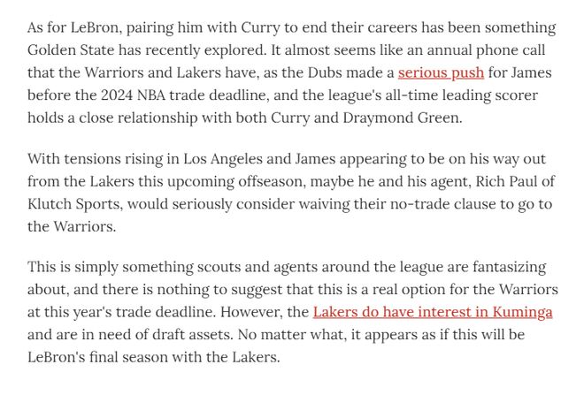 另外一位NBA记者布雷特·西格尔猜测勇士会继续追求詹姆斯,或许詹姆斯和库里会联手。西格尔提到,勇士和湖人每年都会进行例行通话,勇士曾在2024年交易截止日前全力追求詹姆斯,而这詹姆斯与库里和德雷蒙德·格林都保持着密切关系。随着湖人内部紧张局势升级,詹姆斯似乎已注定将在即将到来的休赛期离开湖人,或许他和他的经纪人会认真考虑放弃交易否决权加盟勇士。