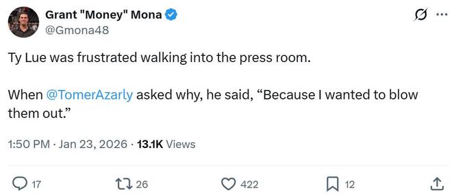值得一提的是,范德比尔特本场险些与祖巴茨爆发冲突,而雷迪克此前曾用“leeway”一词来嘲讽快船队。