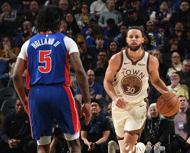 进入下半场,康宁汉姆滑翔飞扣,杜伦顶着穆迪打成2+1,活塞很快就拉开20分分差。库里依旧打铁,穆迪谁都防不住,被轮流点名。中段穆迪终于命中三分,霍福德内突外投打停活塞,库里绕掩护继续轰三分球,横切高难度反身上篮也中。后半段库里继续强攻,但被对手撞了一下,腿部似乎受伤了。节末波杰姆斯基突然爆发,带队咬住分差,三节打完,勇士95-108落后。勇士官方宣布,库里因右膝酸痛,提前退出比赛。决战第四节,勇士没放弃,希尔德+穆迪下三分雨,康宁汉姆带队继续上分,桑托斯联合希尔德,一路追到只差5分!