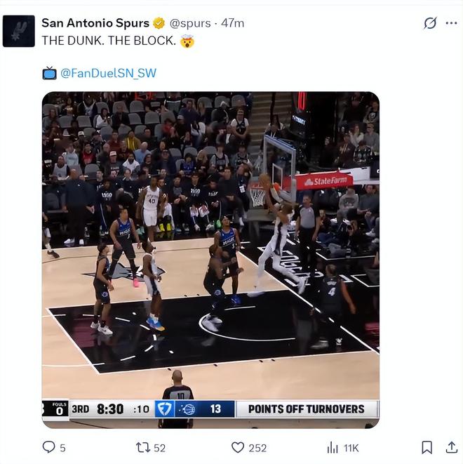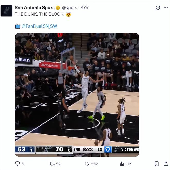 第三节文班亚马又完成了外星人才能完成的技术动作,头撞在篮板上完全空接暴扣,随后反击追身封盖成功,文班亚马第三节7分钟里4中1+罚球7中6拿到8分1助攻1盖帽,三节打完文班亚马已经拿到18分3抢断4盖帽的数据。