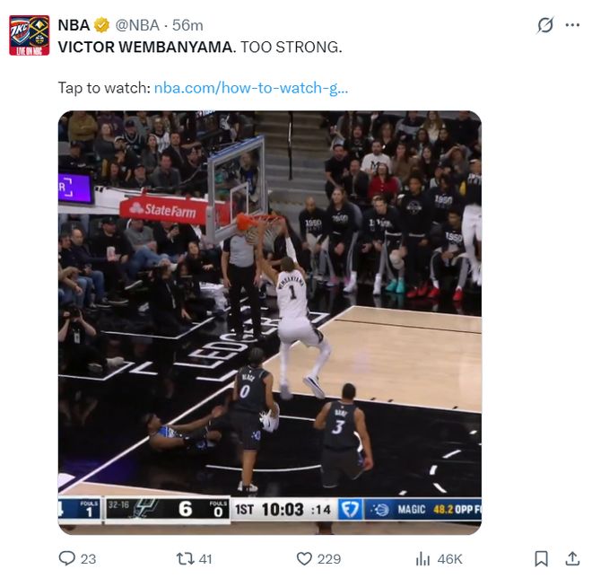 过去的五场比赛文班亚马的效率值很差,场均30.6分钟,拿到20分12.8篮板1.8助攻0.8抢断2.8盖帽2.8失误,命中率42%,三分命中率20%,他作为一个身高2.24米的五号位命中率甚至不如小后卫,但此役开场文班亚马终于开始努力的冲向禁区,他撞开对手完成暴扣,首节5分钟2中2拿到6分4篮板1助攻1盖帽。