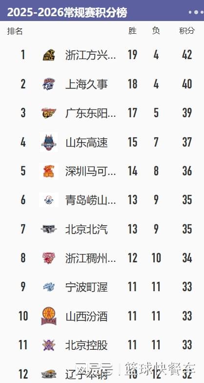 CBA积分榜最新排名出炉!广厦爆冷输球排第1:广东第3辽篮第12