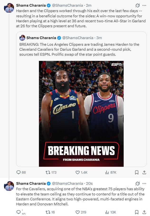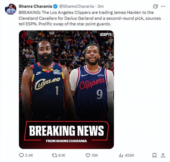NBA交易市场在北京时间2月4日迎来重磅消息:洛杉矶快船队与克里夫兰骑士队达成交易,快船送出詹姆斯·哈登,从骑士换回达里厄斯·加兰和一个2026年的次轮选秀权。