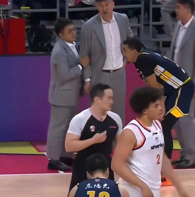 比赛转折点出现在末节一次攻防之后,上海队外援洛夫顿在一次得分后,有一个将球拨向裁判方向的附加动作,这个动作立即引起了广东队教练席的强烈反应。