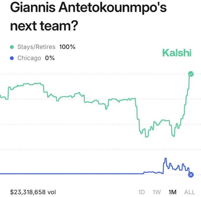 该媒体表示,扬尼斯-阿德托昆博散布谣言说他将离开雄鹿队,导致人们在不受监管的体育竞猜平台Kalshi上花费总计2300万美元,猜测他最终会去哪里。结果他留在了密尔沃基,并且今天公开表示自己是Kalshi的股东。
