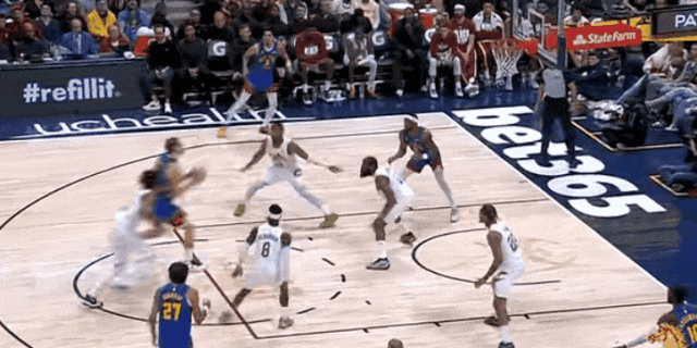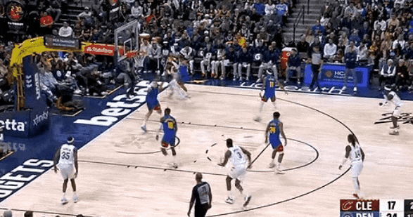 哈登试图找约基奇挡拆,约基奇目送,小哈达维切掉哈登给加雷特·阿伦的传球,逼得哈登自己撤步,射中全场第一个三分。