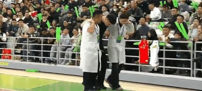 现场医务人员立即上场,34号裁判李津被两位人员给搀扶离场,去接受检查与治疗。