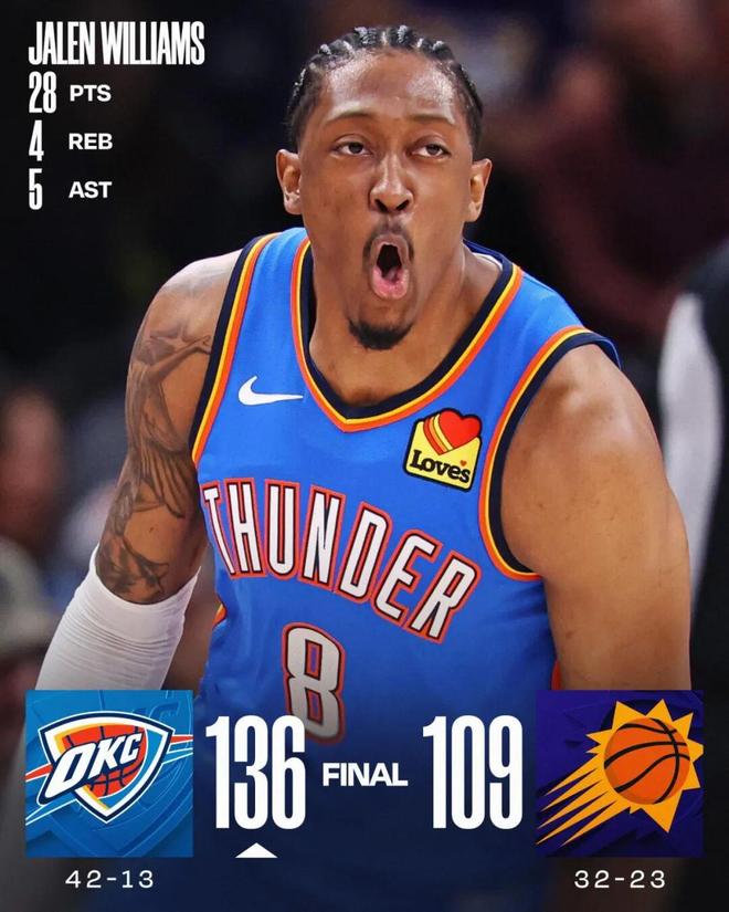 时间回到全明星之前,雷霆对阵太阳的比赛,这场亚历山大、米切尔缺席,然后雷霆后场当家球星杰威打出了非常出色的表现: