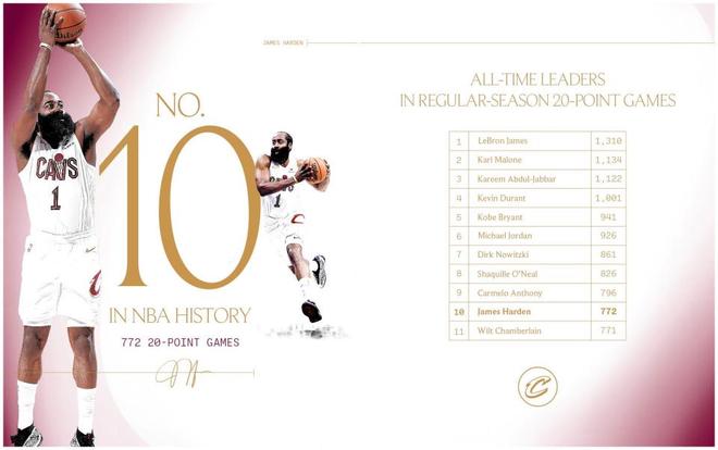 同时本场是哈登生涯第772次单场砍下20+得分表现,成功超越名宿张伯伦升至NBA历史第10,安东尼以796场排名第九,詹姆斯1310场位列历史第一。