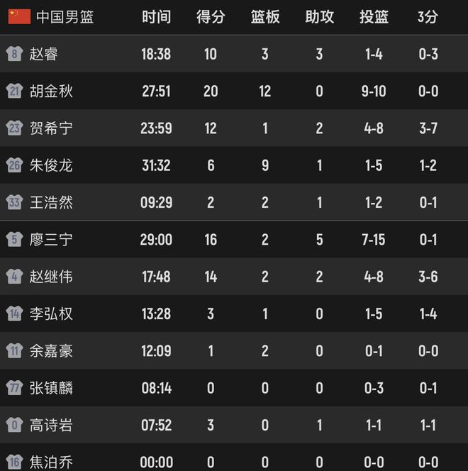 来看看本场数据,中国队多人表现出色,5人得分上双,发挥最好的球员没有疑问,当属胡金秋。大秋全场投篮10中9,拿下20分12篮板的两双数据,包括4个前场板,效率太稳定了,末节发挥突出,是中国队逆转的关键。对比周琦,还是胡金秋更加值得信赖。