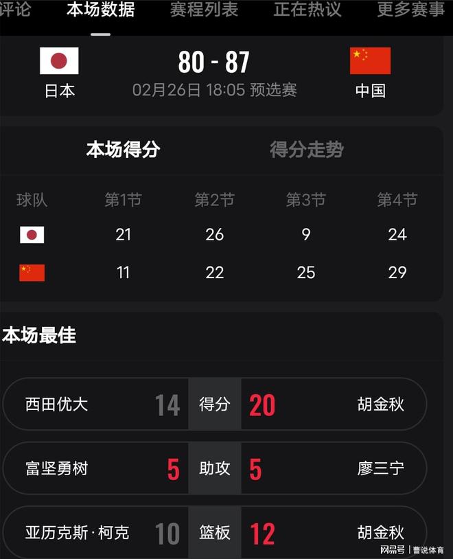 值得一说的是本次世预赛第二窗口期的比赛,反观中国男篮这边进行了变阵,中锋周琦并没有出现在大名单中。周琦不在的情况下,不得不说胡金秋真的是打的越来越出色了,扛起了中国男篮的大旗,胡金秋全场拿到了20分,12篮板的出色数据。