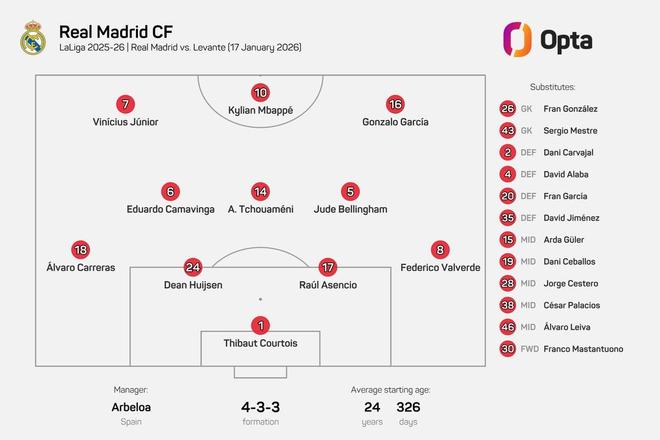 西甲第20轮,皇家马德里主场对阵莱万特,此役皇马首发平均年龄为24岁326天,为有统计以来皇马主帅西甲首秀最年轻首发。