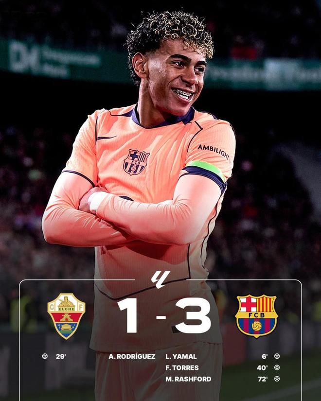 领先之后,巴萨并没有保守,亚马尔在右路持续制造威胁,费尔明和奥尔莫不断前插,埃尔切的防线被拉扯得极不舒服。虽然巴萨大举压上却未能再打破僵局,反倒是被主队抓住机会。
