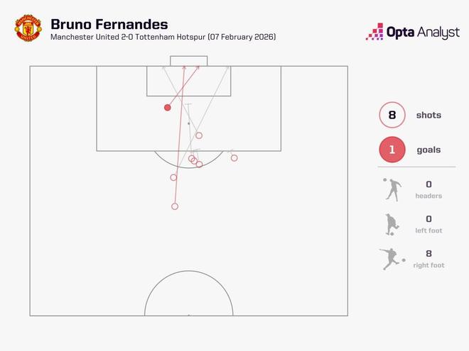 此役主场对阵热刺,布鲁诺-费尔南德斯完成了8次射门,打入1球,此外还创造了6次机会,一共参与了14次射门。