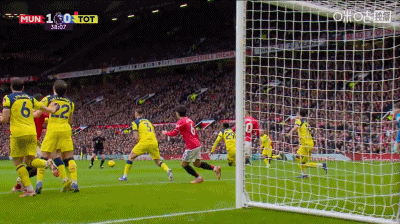 随后梅努将球恰到好处横传至点球点位置,姆伯莫低射攻门,直指球门死角。而马奎尔、肖与卡塞米罗三人合力牵制了热刺所有上前封堵的球员。