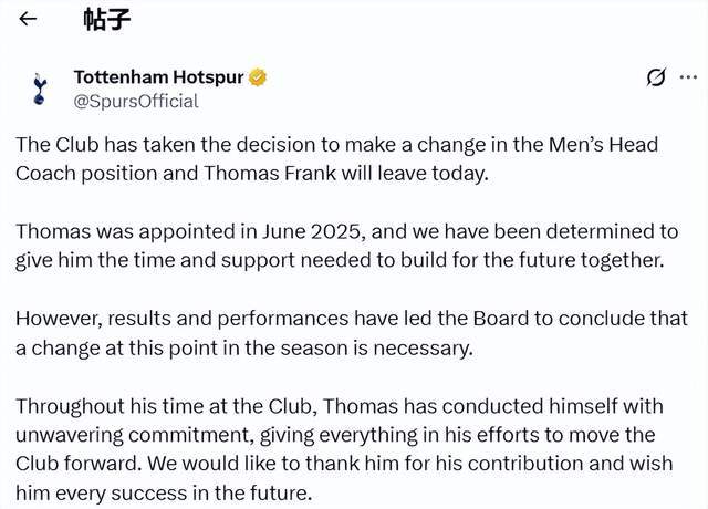 去年夏天,弗兰克正式担任热刺主帅,签约至2028年夏天。执教热刺不到1年,弗兰克带队38场比赛,成绩是13胜10平15负。尽管热刺在英超表现令人失望,但在欧冠,热刺8场17分高居第4位,拿到直通16强席位。