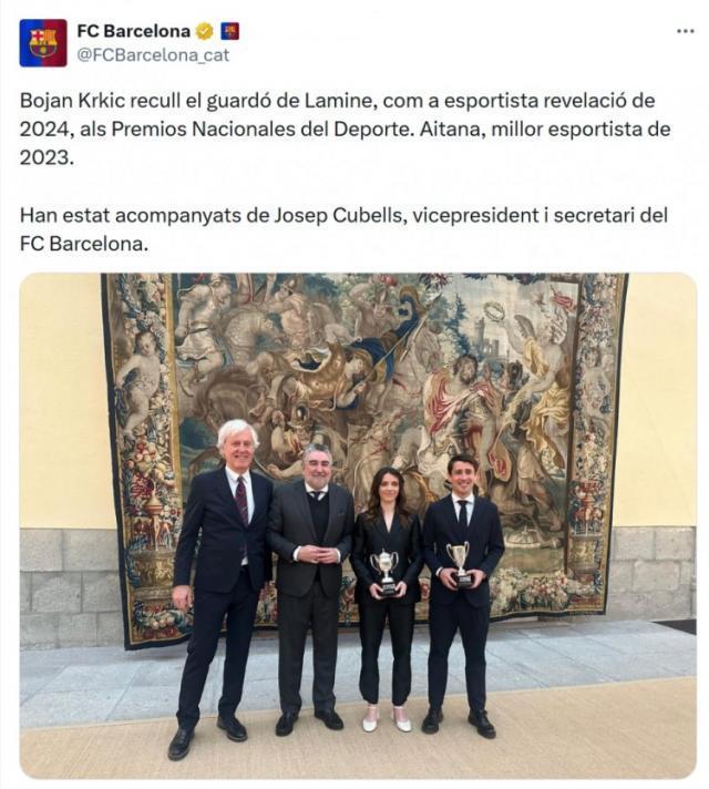 2月11日讯 巴萨边锋亚马尔获得西班牙国家体育奖2024年最佳新人运动员奖,由博扬代为领奖。西班牙国家体育奖颁奖典礼在2026年2月11日进行,表彰2023年、2024年的杰出体育成就。亚马尔2024年表现出色,帮助西班牙国家队赢得欧洲杯冠军,获得2024年最佳新人运动员奖,亚马尔没有出席颁奖典礼,由巴萨足球部门协调员博扬代为领奖。