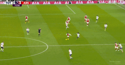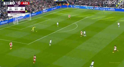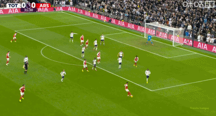 第90+4分钟,厄德高助攻,哲凯赖什倚住防守兜射破门也双响!阿森纳客场4-1热刺!