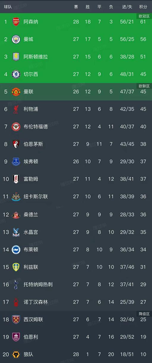 英超最新积分榜